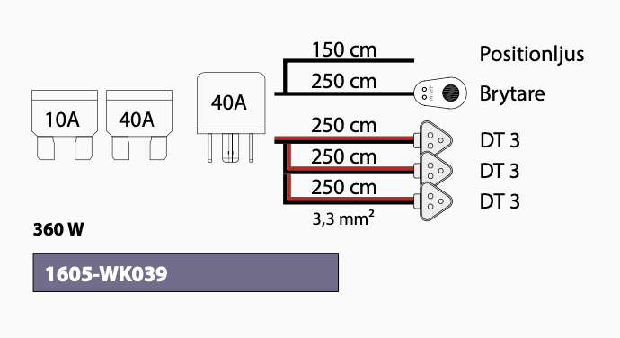 • 40A relä, reläsockel, säkring, strömbrytare och 3-polig DT-kontakt ingår