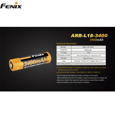 Fenix uppladdningsbara ARB-L2S 18 650 Li-Ion batteri är speciellt utformad för Fenix högintensiva ficklampor. Fenix 18650 har stor kapacitet, enastående prestanda, hög tillförlitlighet och kompakt design.